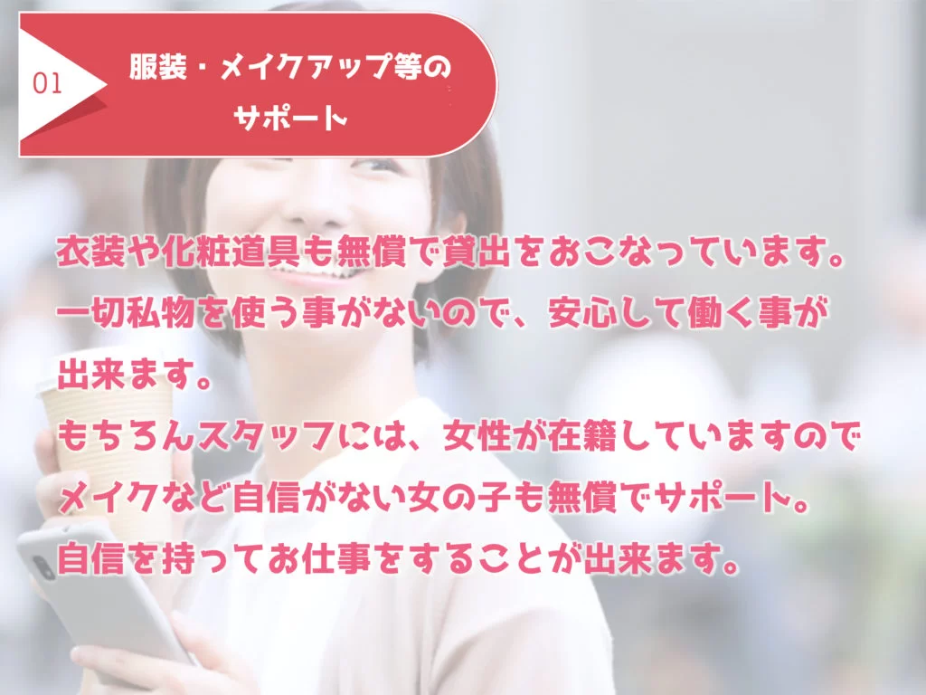 また、機材の使い回しなどは一切なく、衛生面やプライバシーにも配慮。 自分だけの方法で、安心してお仕事に取り組むことができます。